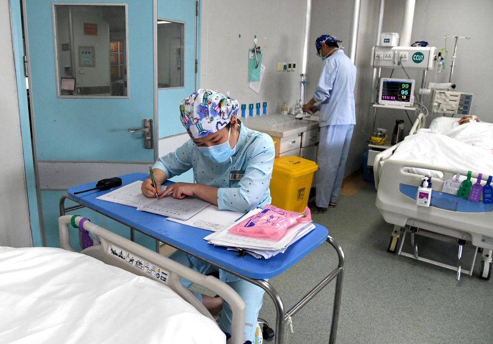 乔冰(前)在河南省直第三人民医院急重症医学中心病房内写护理记录,刘光耀(后)在准备医疗用品(2020年4月26日摄)。