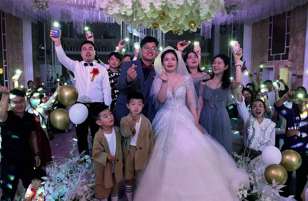 5月20日,刘光耀、乔冰在婚礼上和亲友合影。