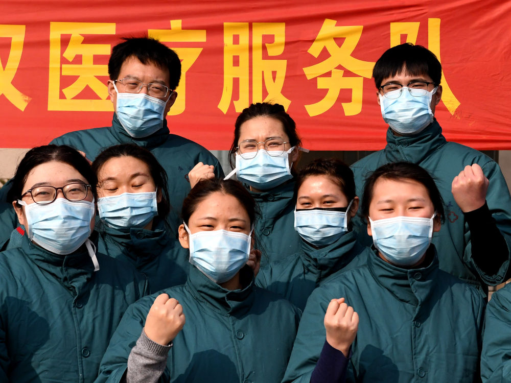 刘光耀(后排右)和乔冰(后排中)在出发武汉前和队友合影(2020年2月2日摄)。