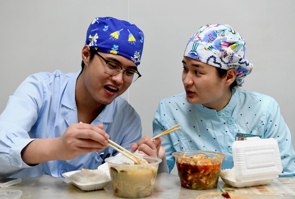 在河南省直第三人民医院急重症医学中心,刘光耀(左)和乔冰在工作间隙一起吃午饭(2020年4月26日摄)。