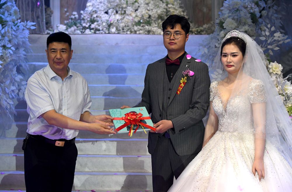 5月20日,河南省直第三人民医院党委书记胡进锋(左)在婚礼上为刘光耀(中)、乔冰送上医院为他俩制作的抗疫纪念册。