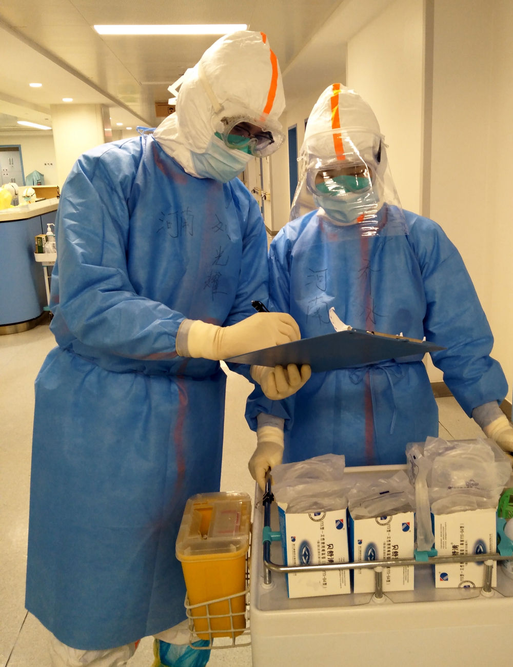 刘光耀(左)、乔冰在武汉同济医院中法新城院区做工作前的准备(资料照片)。