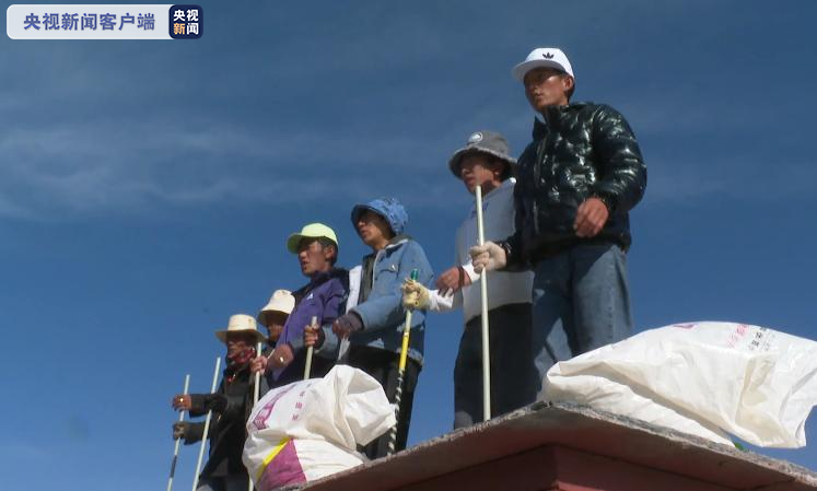 总台央视记者 陈琴:现在我们是在罗布林卡著名的宫殿金色颇章的顶上,我们看见有60名工人正在按照传统的打阿嘎土的方式来修缮屋顶,这也是藏式建筑的一种传统的修旧如旧的维修方式。