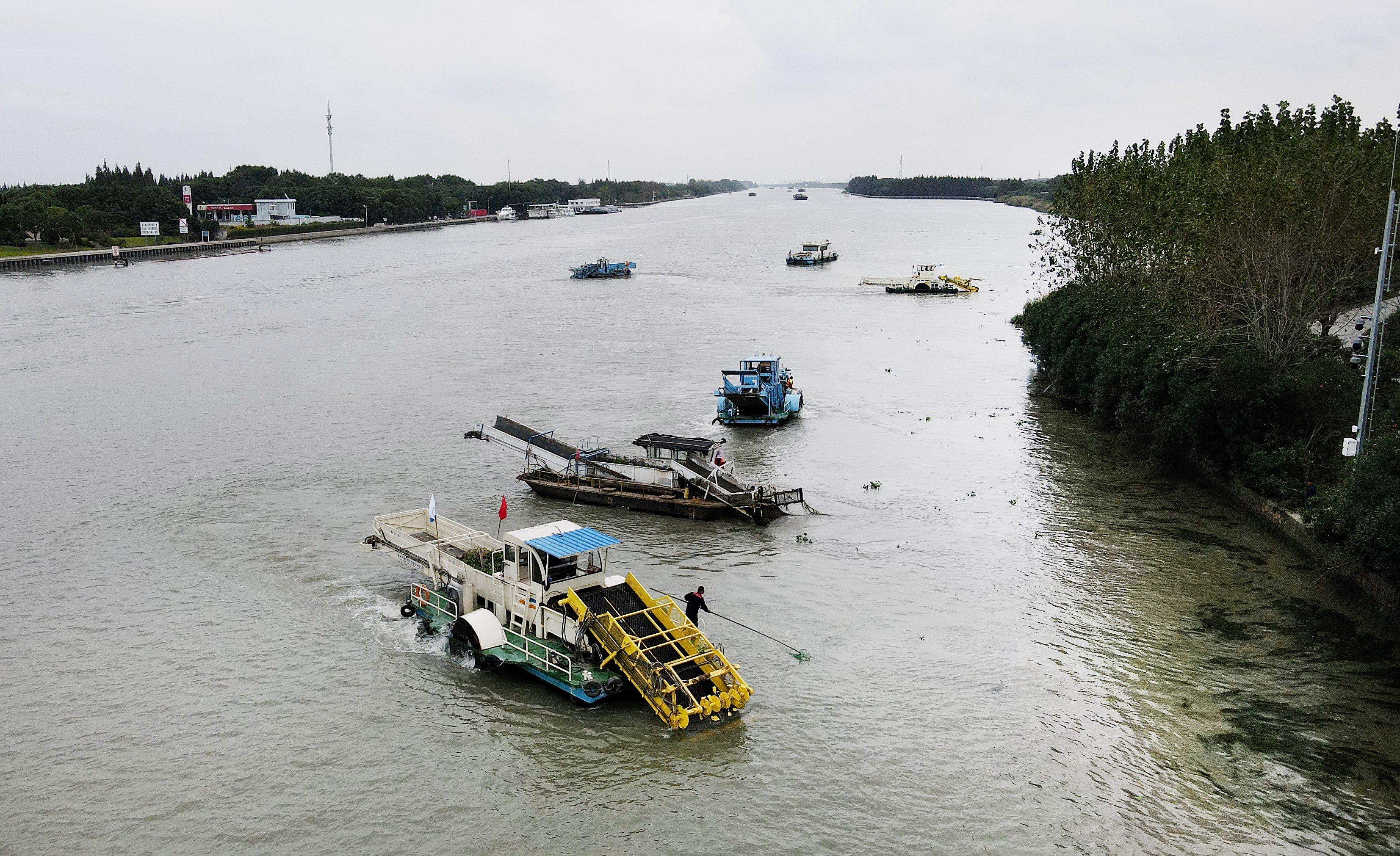 苏浙沪三地的保洁船在太浦河水域联合清理水面浮游植物(新华社发 无人机照片)