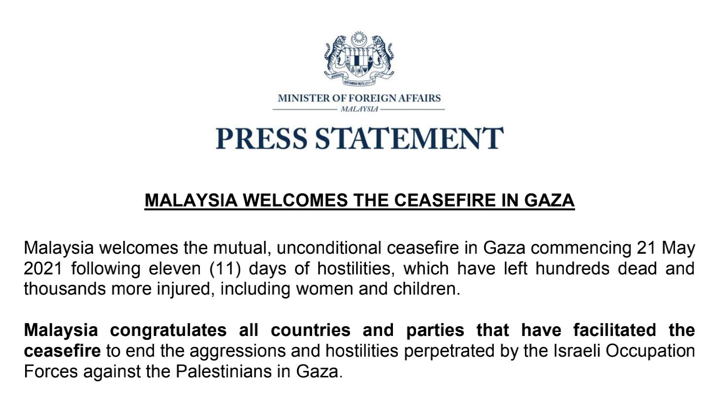 当地时间21日,马来西亚外交部发表声明称,对加沙地带巴以之间无条件停火协议表示欢迎。