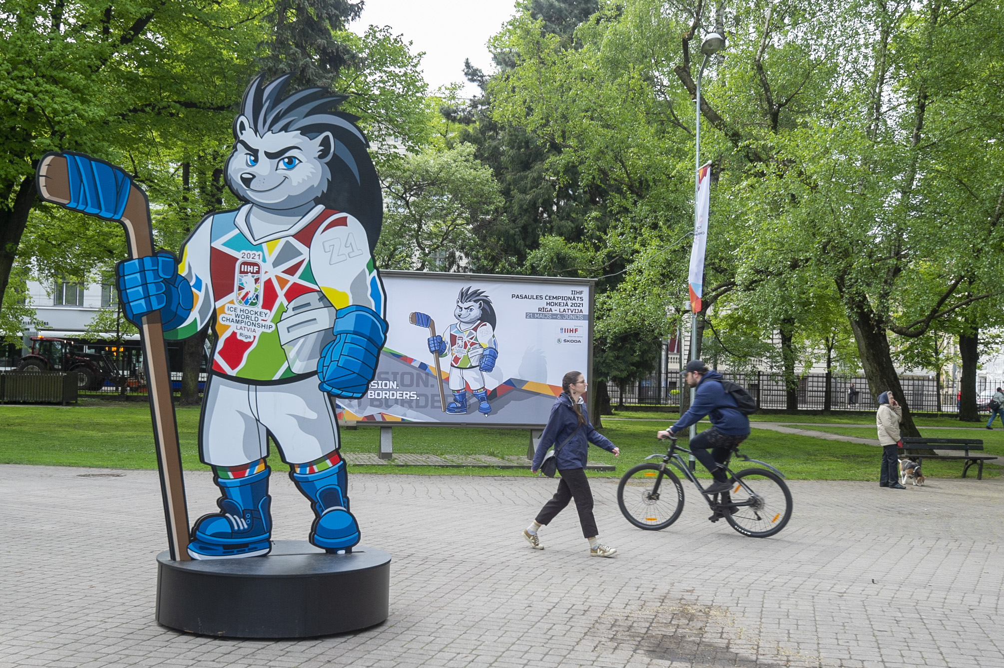 5月20日,在拉脱维亚首都里加,行人从本届冰球世锦赛吉祥物雕像旁走过。新华社发(艾迪斯摄)