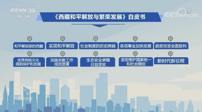 今天(21日)发布的《西藏和平解放与繁荣发展》白皮书共分为十章,分别从和平解放前的西藏、实现和平解放、社会制度的历史跨越、各项事业加快发展、脱贫攻坚全面胜利、优秀传统文化得到保护和发展、民族宗教工作成效显著、生态安全屏障日益坚实、坚定维护国家统一和社会稳定、新时代新征程10个方面进行阐述,回顾历史进程、展示伟大成就,全面立体真实展现社会主义新西藏。