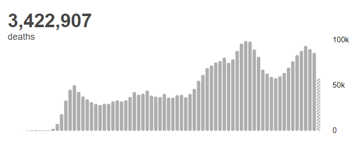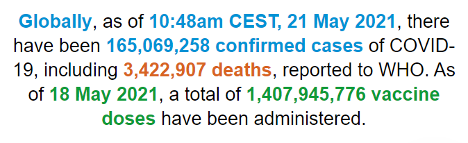 根据世卫组织最新实时统计数据,截至欧洲中部夏令时间5月21日10时48分(北京时间5月21日16时48分),全球累计新冠肺炎确诊病例165069258例,累计死亡病例3422907例。