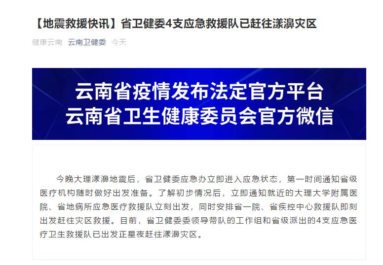 目前,云南省卫健委委领导带队的工作组和省级派出的4支应急医疗卫生救援队已出发正赶往漾濞灾区。
