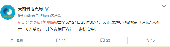 截至5月21日23时30分,云南漾濞6.4级地震已造成1人死亡,6人受伤,其他灾情正在进一步核实中。