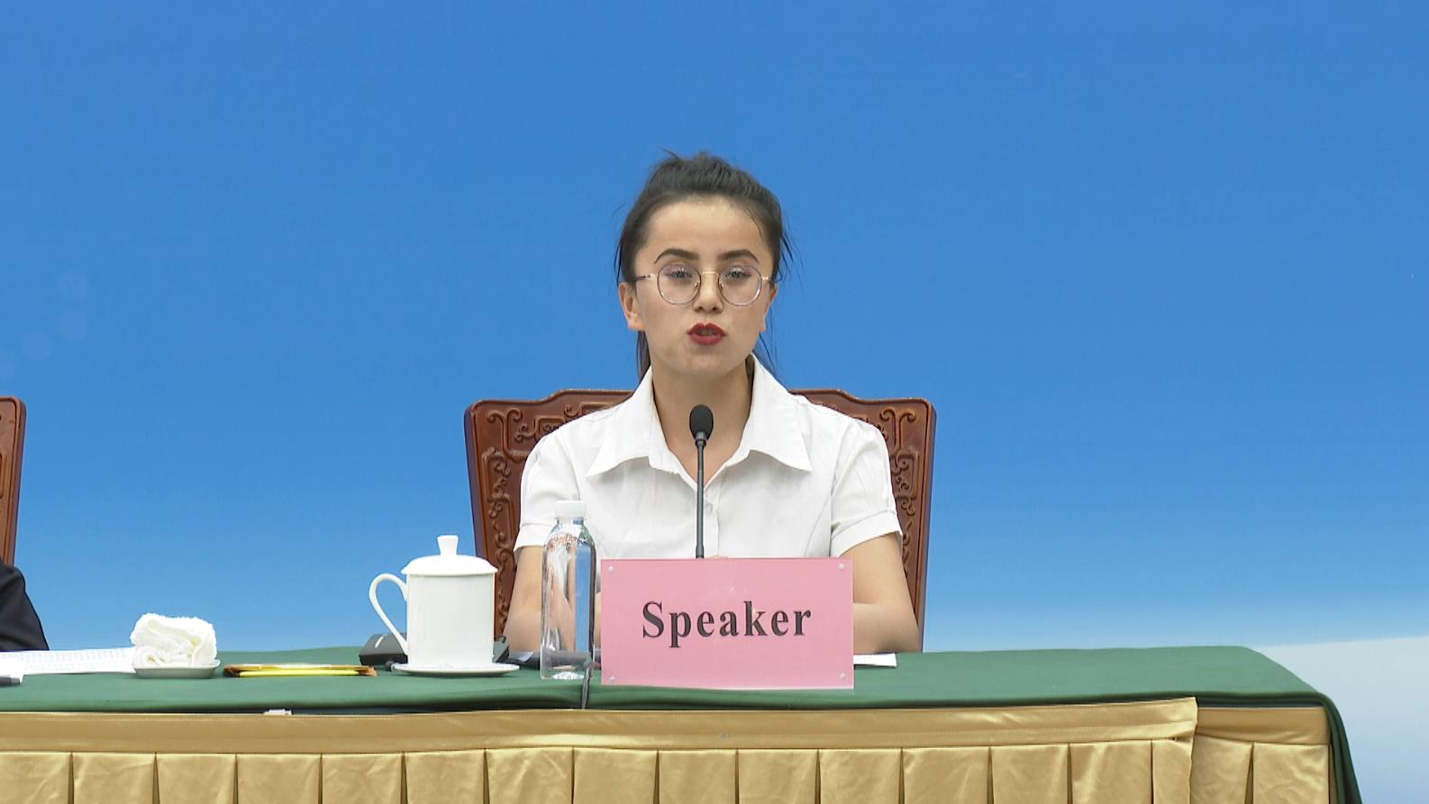 新疆阿克苏地区库车市教培中心结业学员祖比艳·亚生在会上介绍通过学习培训摆脱宗教极端思想、当上村干部、服务群众的情况,揭批美西方反华势力所谓“教培学员遭迫害”谎言。