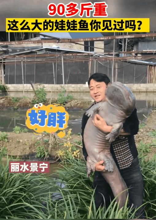 △近日,浙江丽水一巨型娃娃鱼的视频走红网络。据农场主人介绍,这条巨型娃娃鱼是从2009年开始养殖的,如今重量高达90多斤,身长大概有一米三到一米五。