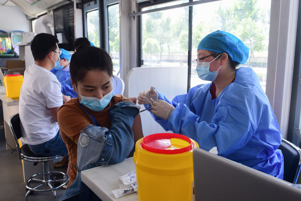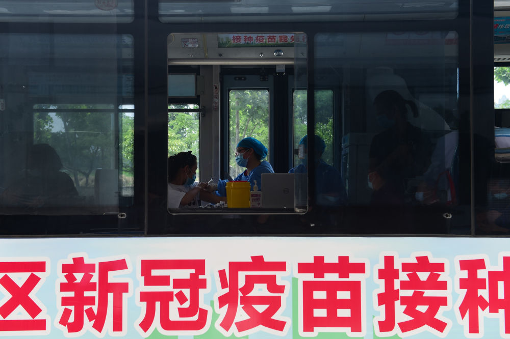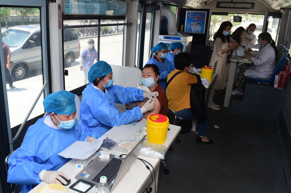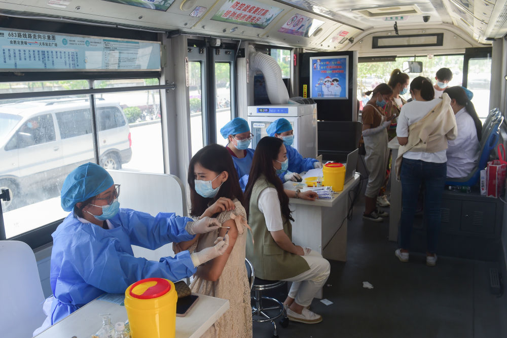 5月21日,在合肥物联网科技产业园,企业员工在流动疫苗接种点接种新冠疫苗。
