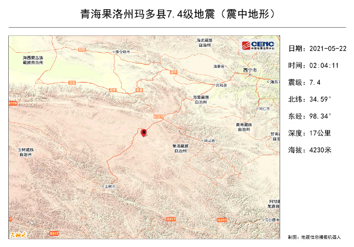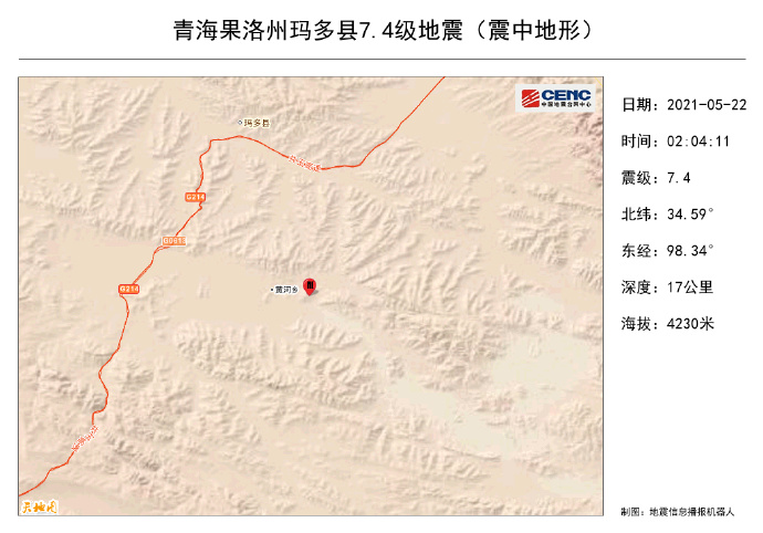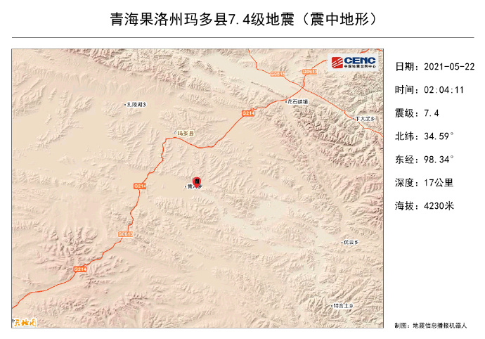 青海玛多7.4级地震,这次地震是汶川地震之后我国发生的震级最高的一次地震,另外几次七级地震分别是:2017年四川九寨沟7.0级、2014年新疆于田7.3级地震、2013年四川芦山7.0级地震、2010年青海玉树7.1级地震。