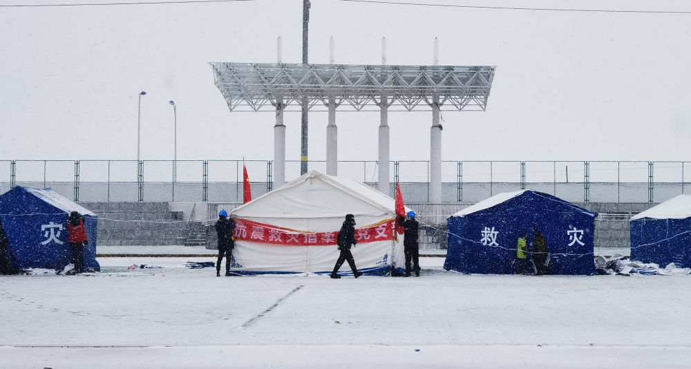 ↑5月22日,救援人员在玛多县搭建帐篷。