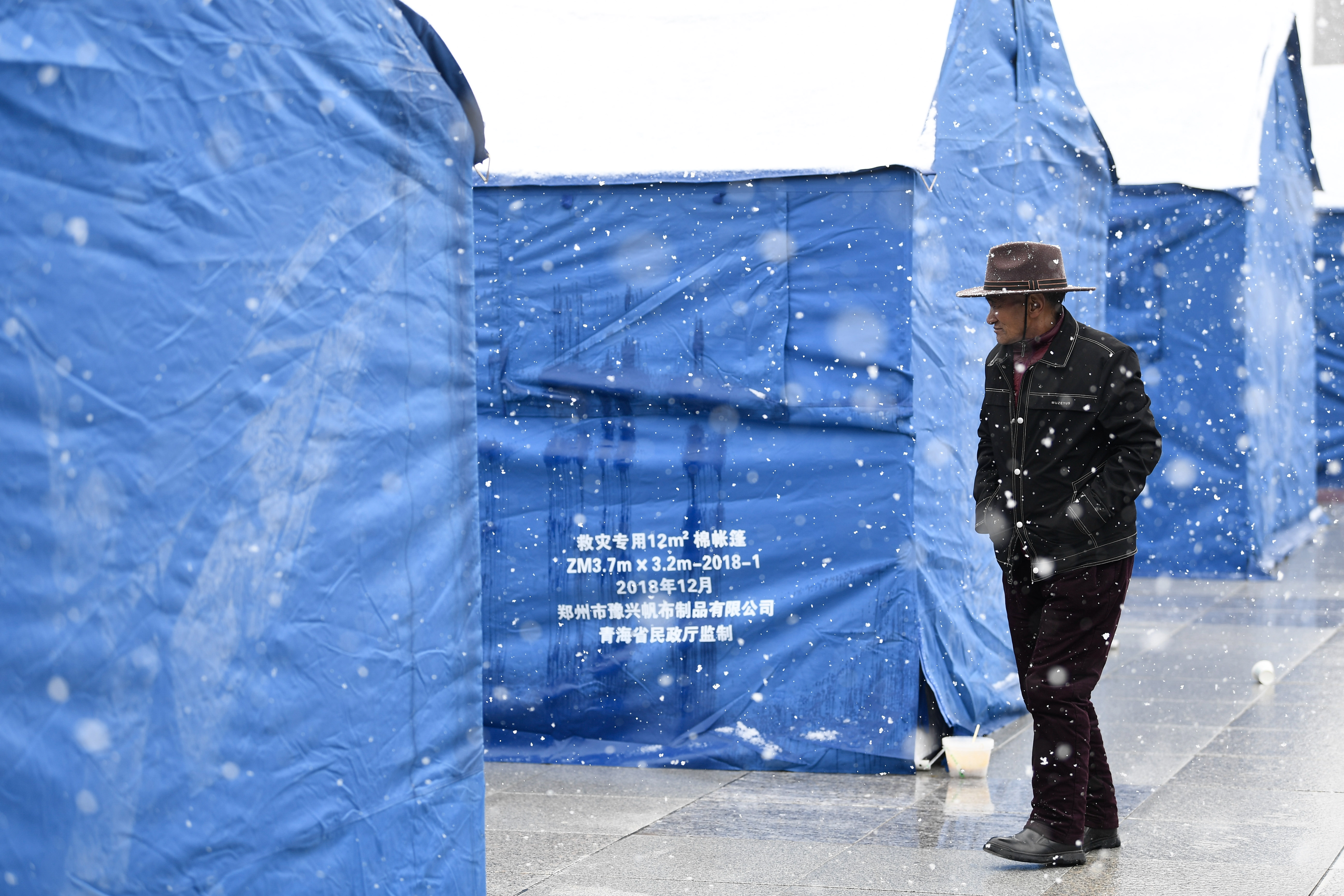 5月22日,当地受灾牧民行走在救灾帐篷营区里