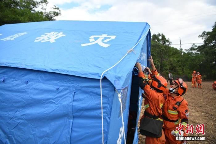 5月22日,云南省森林消防总队大理支队的救援人员为民众搭建救灾帐篷。中新社记者 刘冉阳 摄