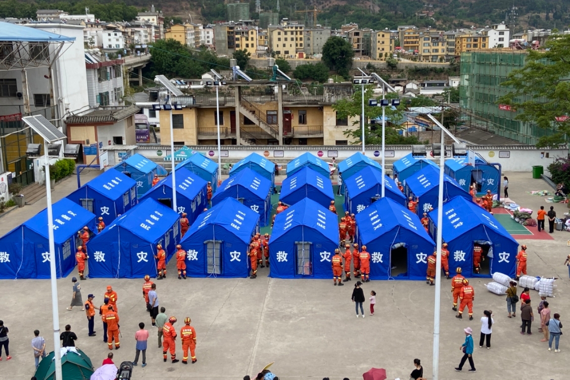 5月22日12时17分,保山市消防救援支队全勤指挥部、升阳路特勤站、战勤保障站68人赶赴大理漾濞客运站旁篮球厂,帮助灾区群众搭建帐篷。