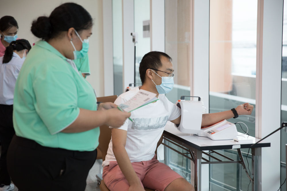 5月20日,一名中国公民在泰国曼谷邦叻区疫苗接种中心测量血压。(新华社记者张可任摄)