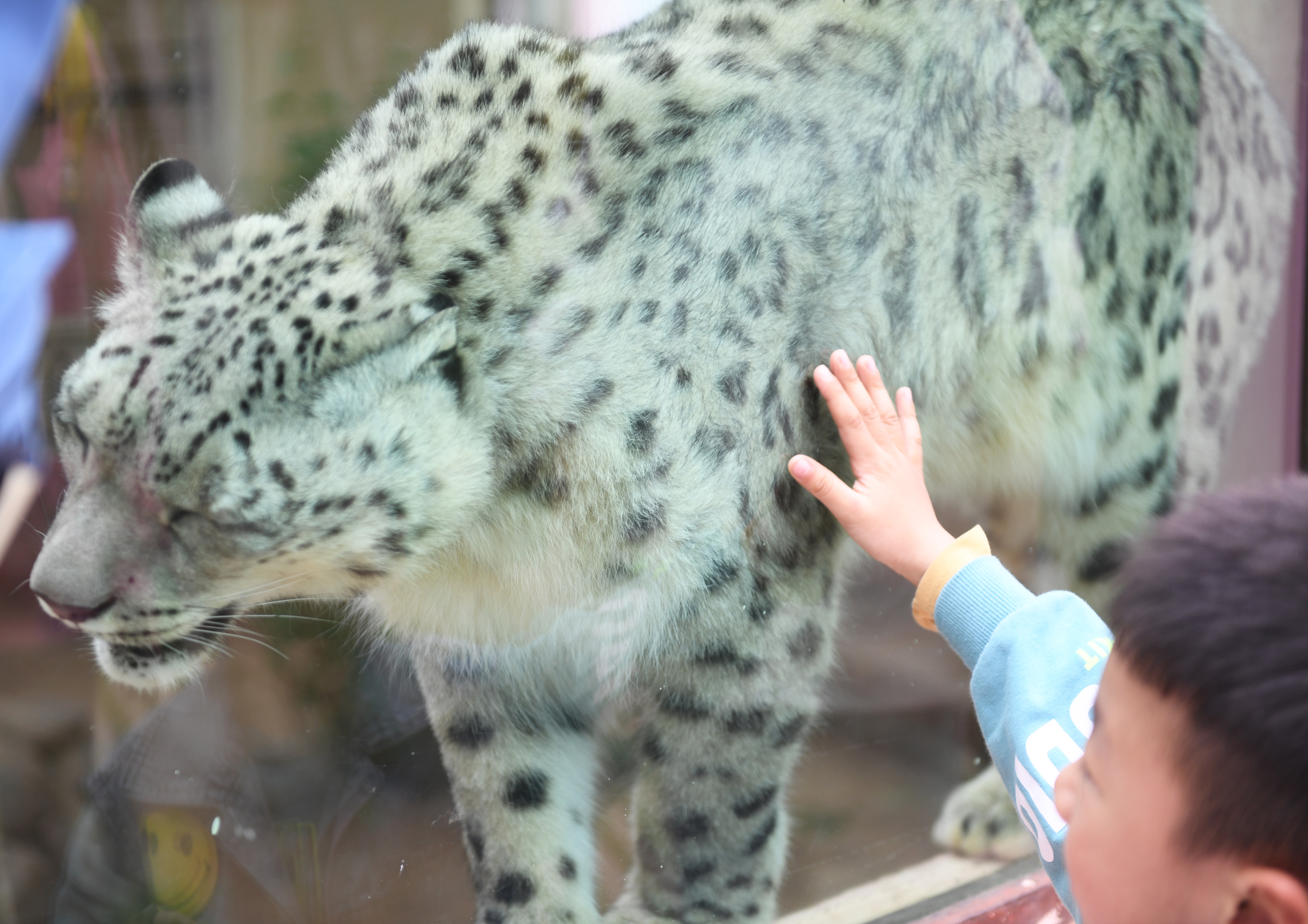 在青海省西宁野生动物园拍摄的正在与小朋友互动的雪豹(5月21日拍摄)。新华社记者张曼怡 摄