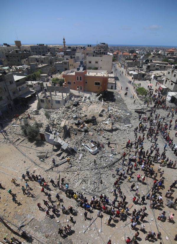 5月20日,巴勒斯坦人在加沙地带的拉法查看以色列空袭后的建筑废墟。(新华社)