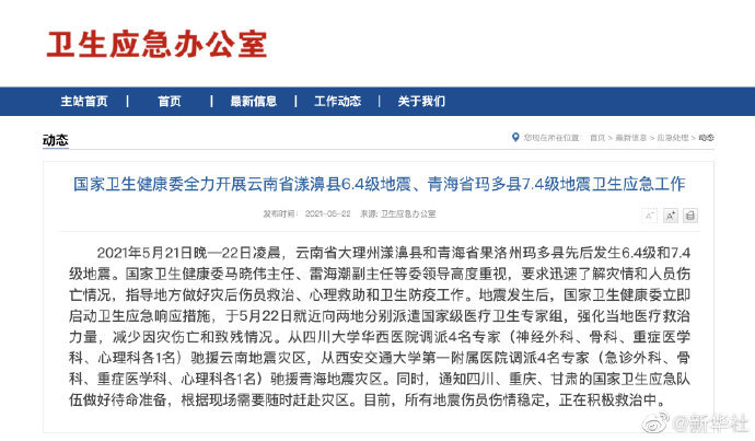 据国家卫健委最新消息,云南和青海发生地震后,国家卫健委立即启动卫生应急响应措施,于5月22日就近向两地分别派遣国家级医疗卫生专家组,强化当地医疗救治力量,减少因灾伤亡和致残情况。从四川大学华西医院调派4名专家驰援云南地震灾区,从西安交通大学第一附属医院调派4名专家驰援青海地震灾区。同时,通知四川、重庆、甘肃的国家卫生应急队伍做好待命准备,根据现场需要随时赶赴灾区。目前,所有地震伤员伤情稳定,正在积极救治中。