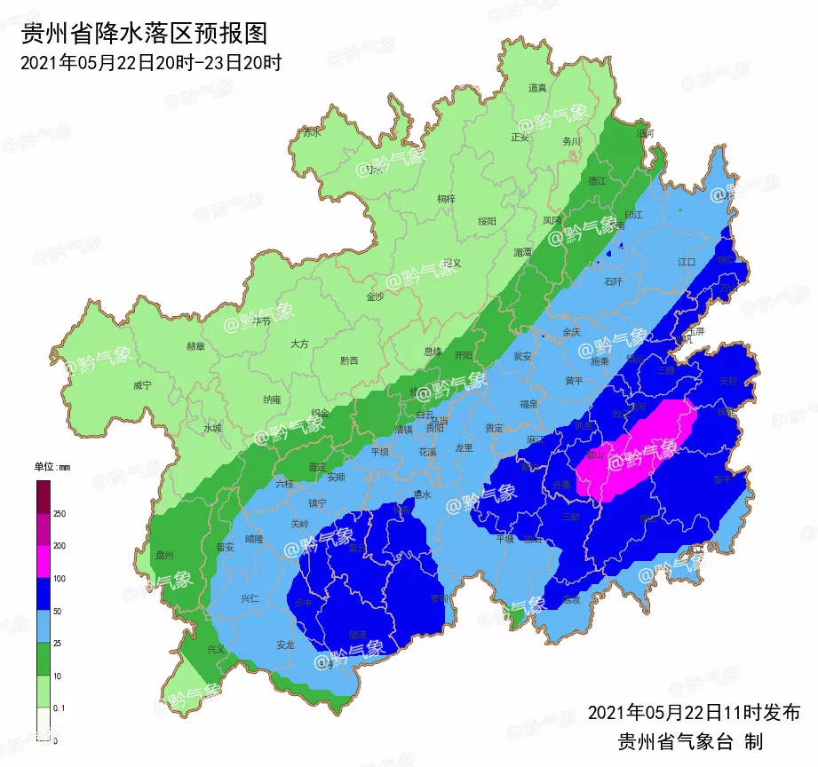 贵州省气象台5月22日继续发布暴雨预报,预计22日夜间贵州省的北部地区阴天有阵雨,其余地区阴天有阵雨或雷雨,雨量中到大雨,铜仁市东南部、黔东南州大部、黔南州中南部、安顺市南部及黔西南州东南部局地暴雨,部分乡镇有大暴雨,西南部局地有强对流天气;23日白天,贵州全省阵雨转阴天,东南部边缘局地中雨,个别乡镇大到暴雨。