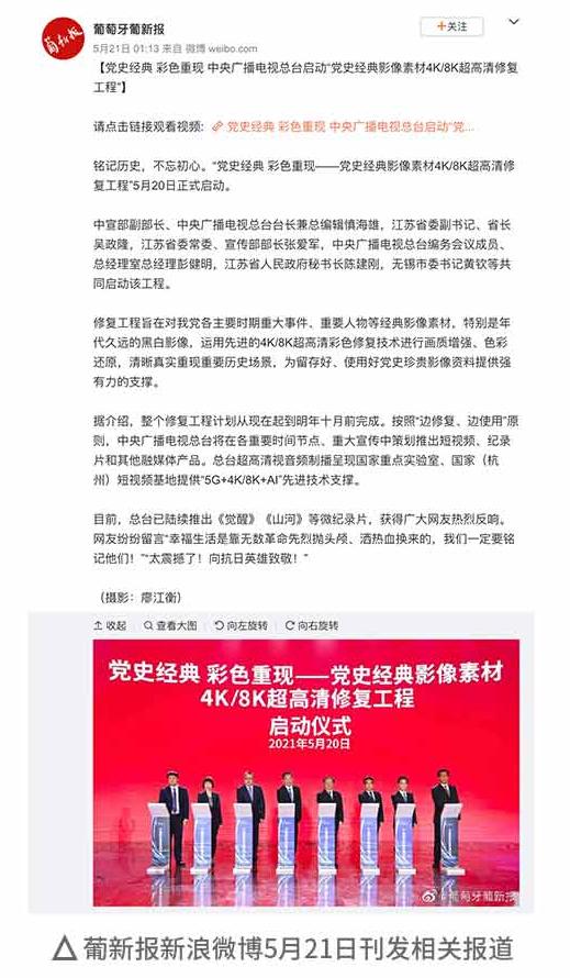铭记历史,不忘初心。中央广播电视总台“党史经典彩色重现——党史经典影像素材4K/8K超高清修复工程”已于5月20日正式启动。