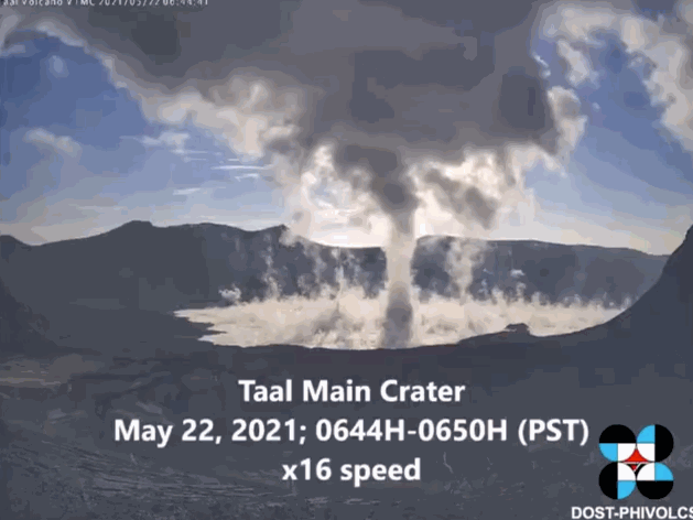 菲律宾火山地震研究所在5月22日发布一段视频显示,当天早上6时44分到6时50分,菲律宾塔阿尔火山的火山口湖中喷出高达1.5千米的火山羽流,这是由于火山的灼热液体上升形成的。