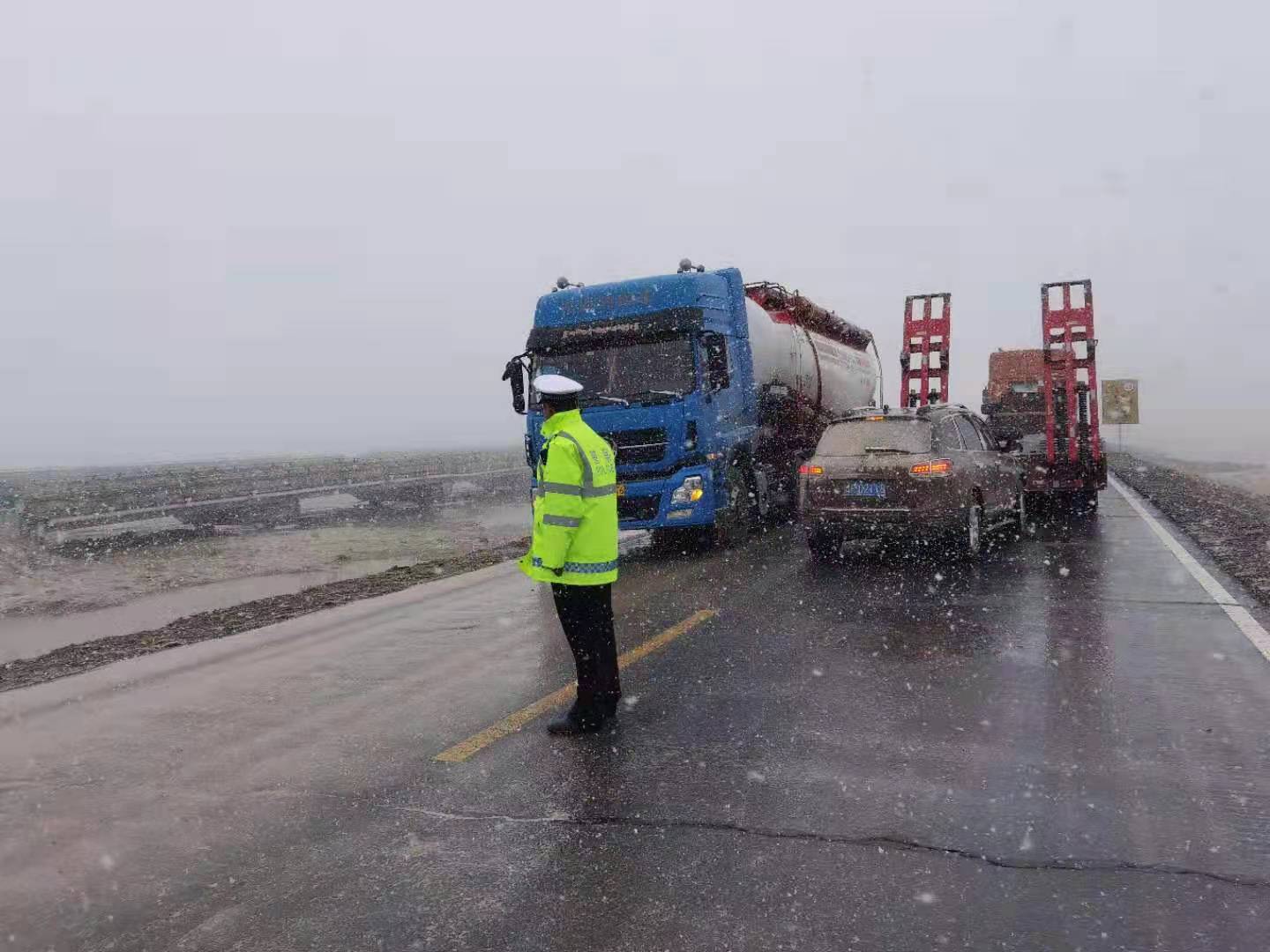 5月22日,青海省海南藏族自治州公安局交警支队民警正在受灾路段维护交通秩序。