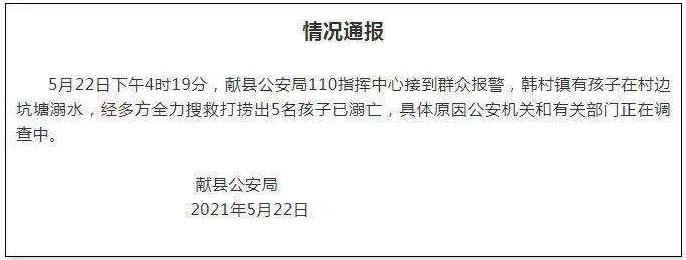 5月22日,河北沧州献县公安局发布情况通报,当天下午4时19分,献县公安局110指挥中心接到群众报警,韩村镇有孩子在村边坑塘溺水,经多方全力搜救打捞出5名孩子已溺亡,具体原因公安机关和有关部门正在调查中。(总台记者 谢宾超)