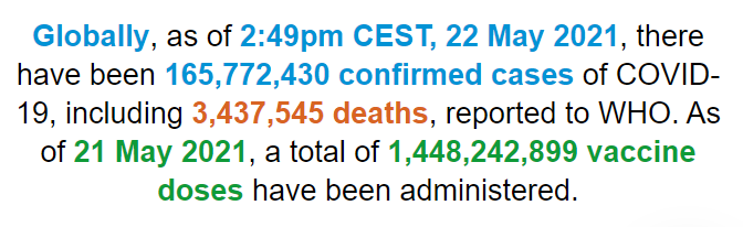根据世卫组织最新实时统计数据,截至欧洲中部夏令时间5月22日14时49分(北京时间5月22日20时49分),全球累计新冠肺炎确诊病例165772430例,累计死亡病例3437545例。22日全球新冠肺炎确诊病例新增607681例,死亡病例新增12457例。