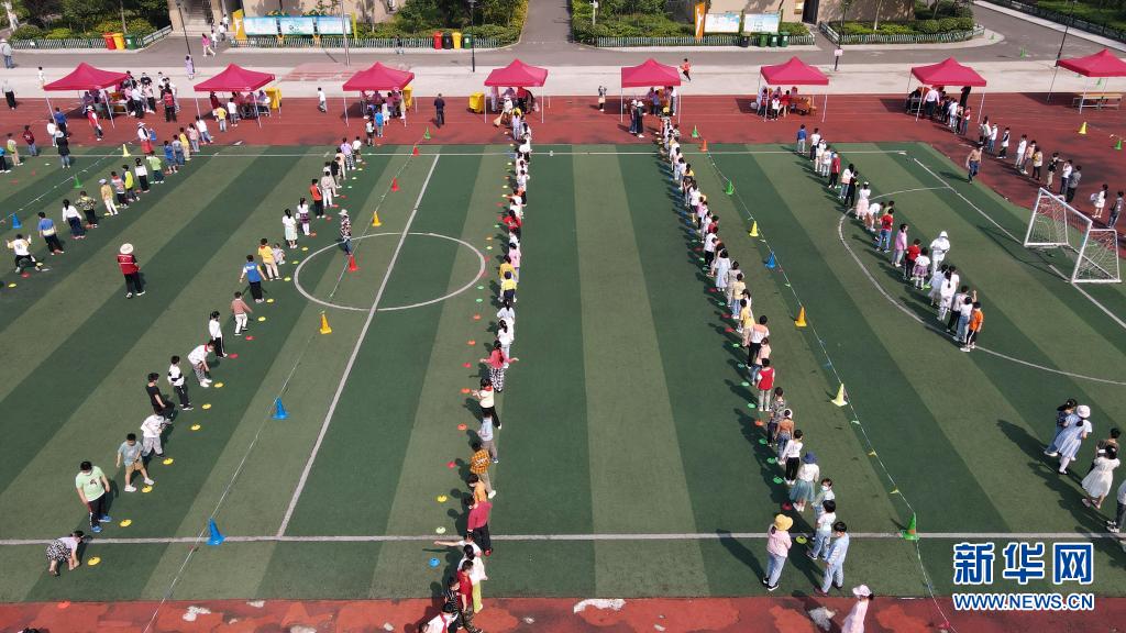 5月22日,在六安市解放路第二小学,检测人员为学生进行核酸采样(无人机照片)。新华社记者 周牧 摄