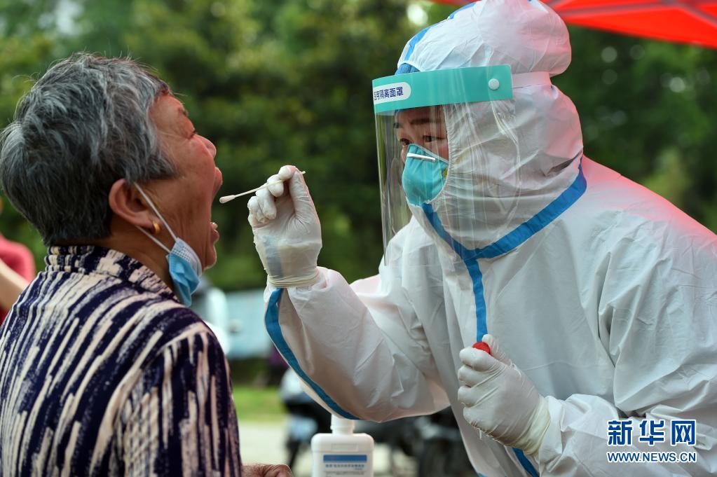 5月22日,在六安市裕安区振兴社区,检测人员为居民进行核酸采样。新华社记者 周牧 摄