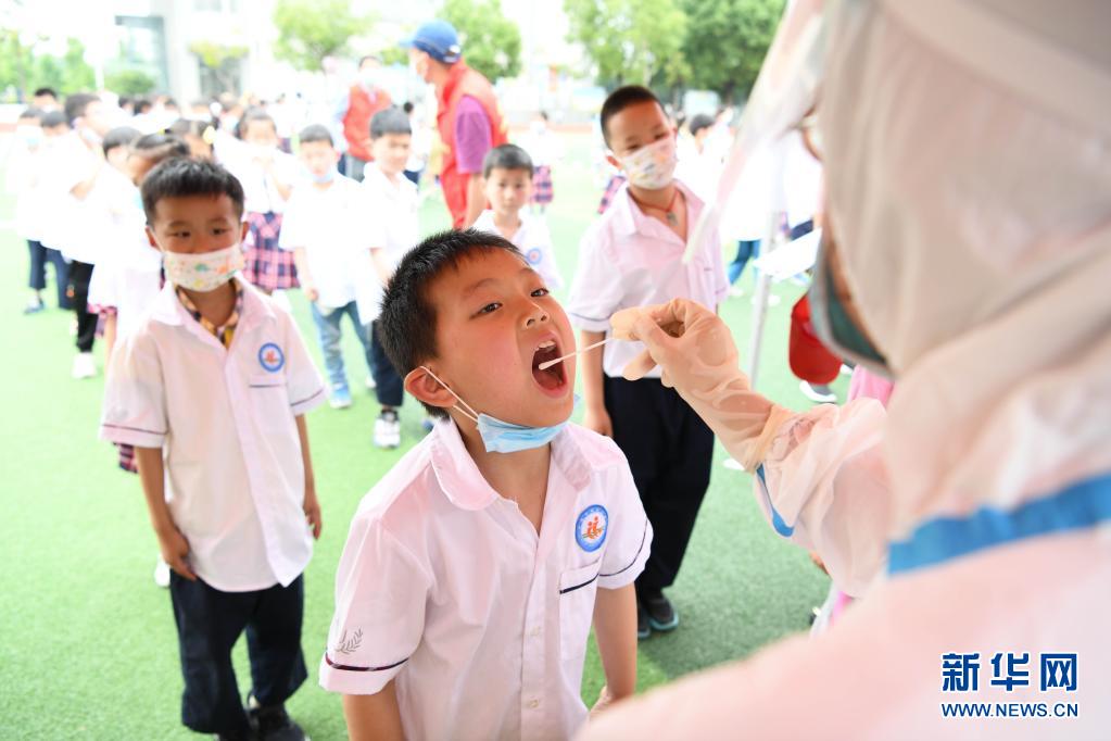 5月22日,学生在六安市城北小学接受核酸采样。新华社记者 张端 摄