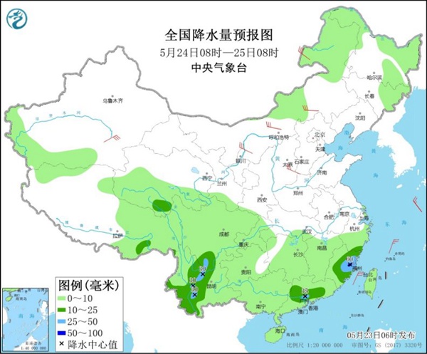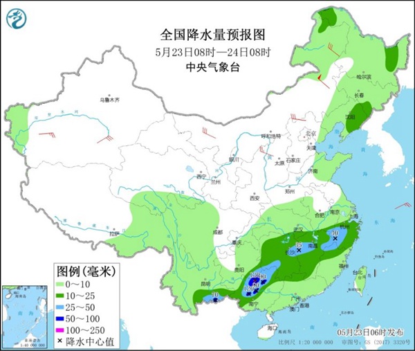 今后三天(5月23日至25日),南方降雨将明显减弱,强降雨区域有所南压,但本轮降雨较前期过程中强降雨落区有重叠,特别是贵州、湖南、江西等地需警惕降雨叠加的致灾性。气温方面,受冷空气影响,今天北方气温将明显波动,尤其是东北地区降温明显,公众需及时添衣,谨防着凉。
