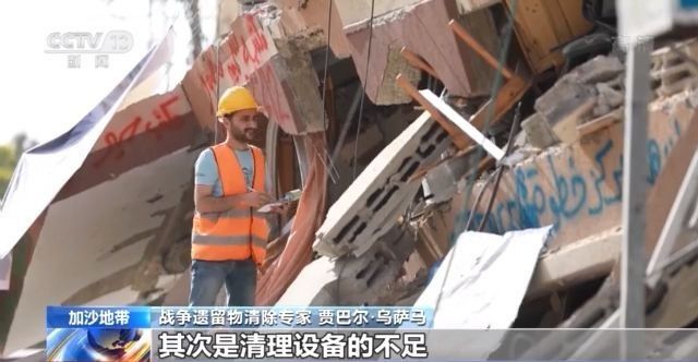 战争遗留物清除专家 贾巴尔·乌萨马:我们清障时面临许多困难,首先是(损毁的建筑有)发生倒塌的风险,其次是清理设备的不足,包括手动设备和机械设备,比如挖掘机、夯锤和其他设备等对于工人来说已经陈旧且不安全。