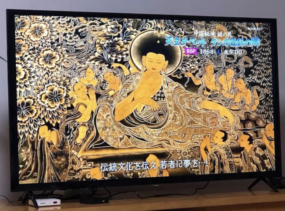 2021年2月28日,在日本东京拍摄的日本广播协会播出的纪录片《唐卡画师之乡》预告片电视画面。新华社发