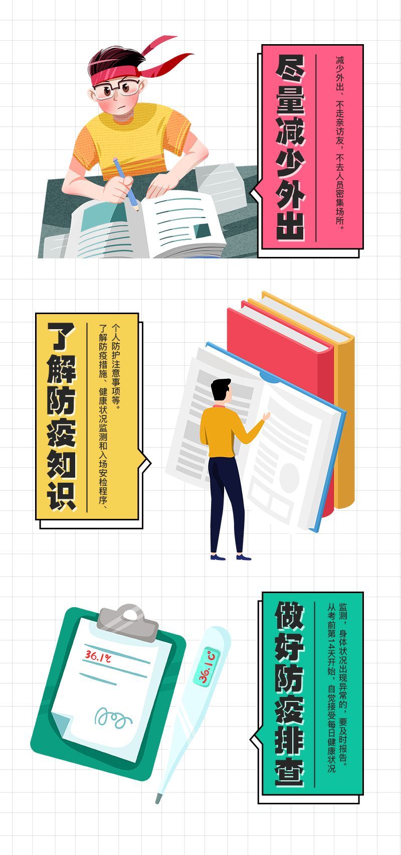 辽宁省高中等教育招生考试委员会办公室近日也发布对高考考生疫情防控十项提醒,考生要自觉通过主流媒体和官方渠道了解新冠病毒疫情防控和诚信赴考常识,知晓防疫措施、健康状况监测和入场安检程序、个人防护注意事项等。