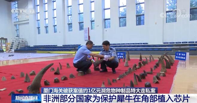 据厦门海关缉私人员介绍,非洲部分国家为保护犀牛在犀牛的角部植入芯片,建立犀牛的身份系统。然而厦门海关缉私民警通过扫描竟发现此次查获的犀牛角中有70块是含有芯片信息的,进一步证实了走私货物是来自非洲。