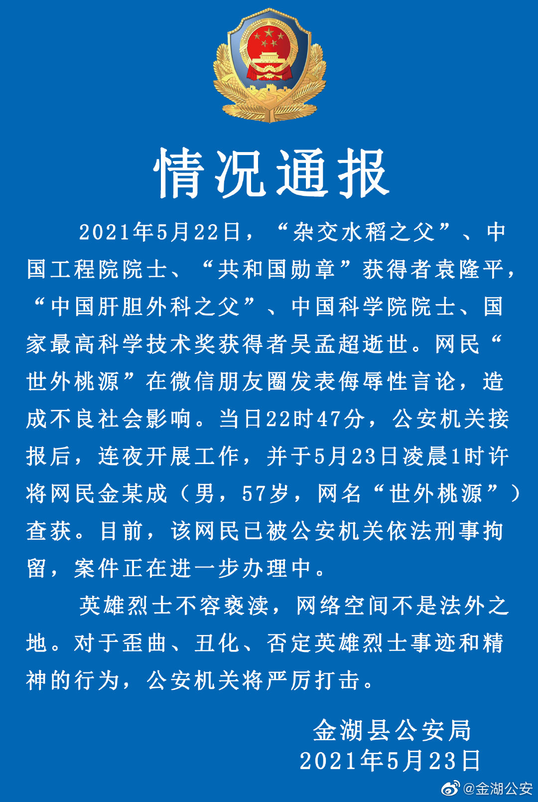 5月23日,江苏省淮安市金湖公安发布通报:金湖公安机关对一名针对袁隆平、吴孟超两位院士逝世在网上发布侮辱性言论的男子采取刑事强制措施。(总台央视记者 黄成)