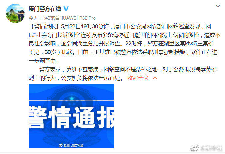【厦门一网民侮辱4院士专家被警方控制】据@厦门警方在线 23日发布警情通报,5月22日19时30分许,厦门市公安局网安部门网络巡查发现,网民“社会专门投诉微博”连续发布多条侮辱近日逝世的四位院士专家的微博,造成不良社会影响。当日22时许,警方在KTV内将王某雄(男,30岁)抓获。目前,案件正在进一步调查中。(记者颜之宏)