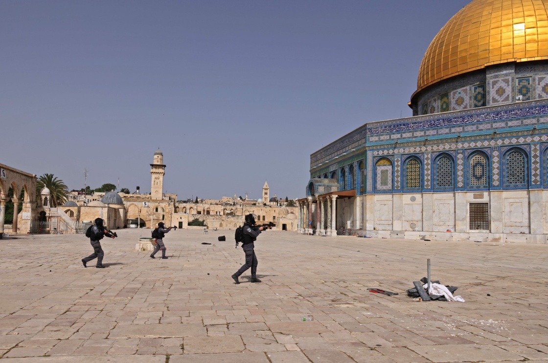 △耶路撒冷老城圣殿山(穆斯林称“尊贵禁地”)附近再次爆发冲突(图片来源:巴勒斯坦马安通讯社)