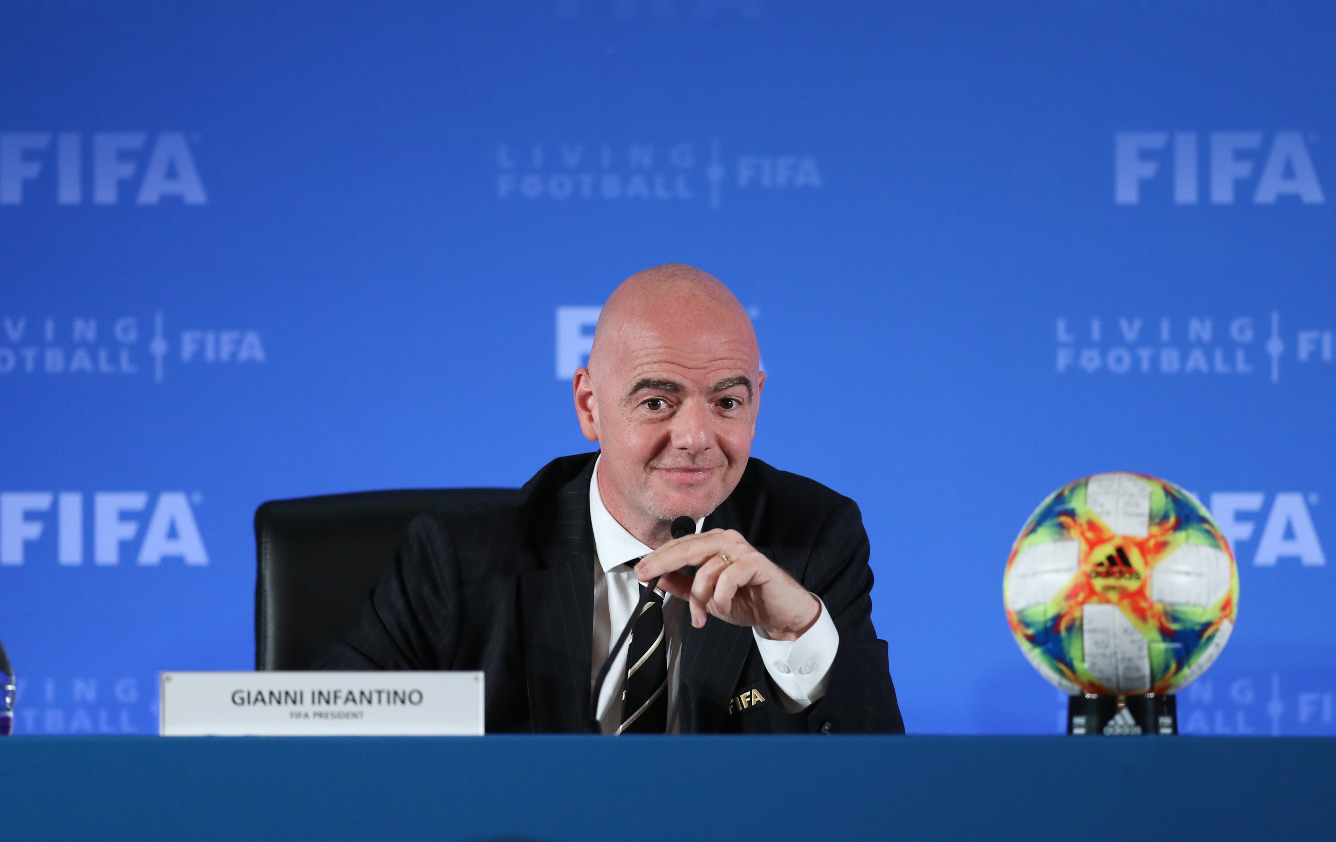 资料图:国际足联主席因凡蒂诺在新闻发布会上答记者提问。新华社记者丁汀摄
