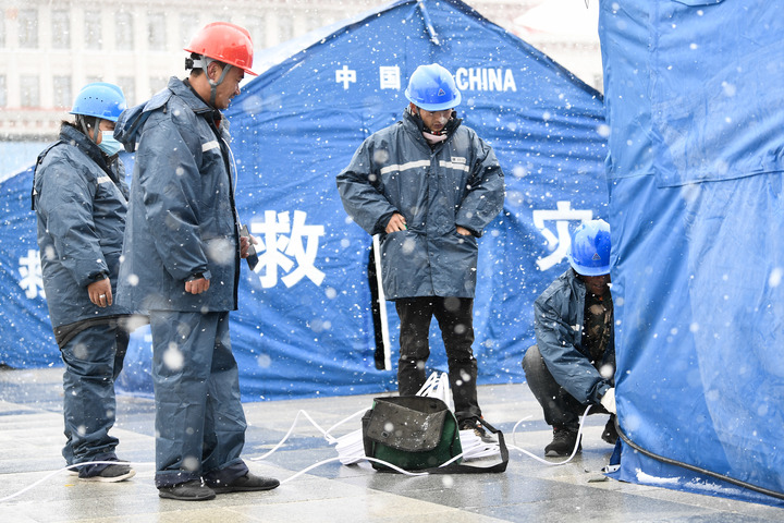 5月22日,国网玛多供电公司工作人员正在给救灾帐篷接电。新华社记者 张龙 摄