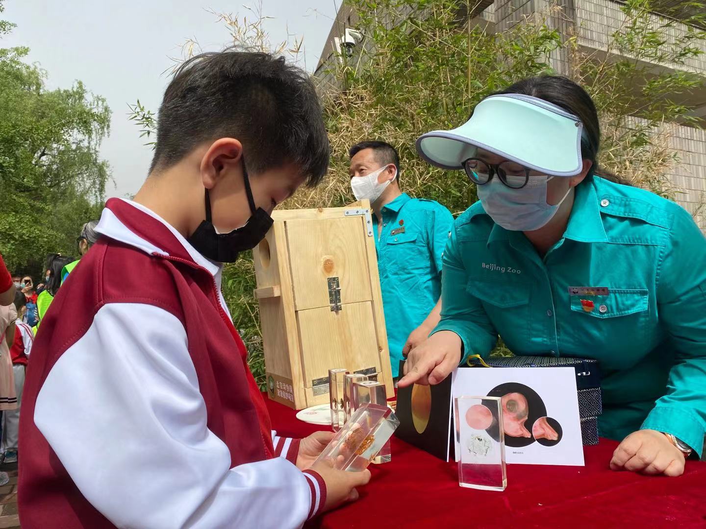 在北京动物园主会场,一场以“保护鸟类 爱护自然”为主题的科普剧邀请游客拜访朱鹮、丹顶鹤、大鲵等动物的“家”,启发小朋友们的好奇心和想象力。现场设立了“失而复得的朱鹮”“野生鸳鸯生态保护”模型展示、动物体检、动物丰容等互动项目,还以大熊猫系列教学模型、东北虎头骨模型、不同生态类群鸟喙模型为观众解读“动物密码”。