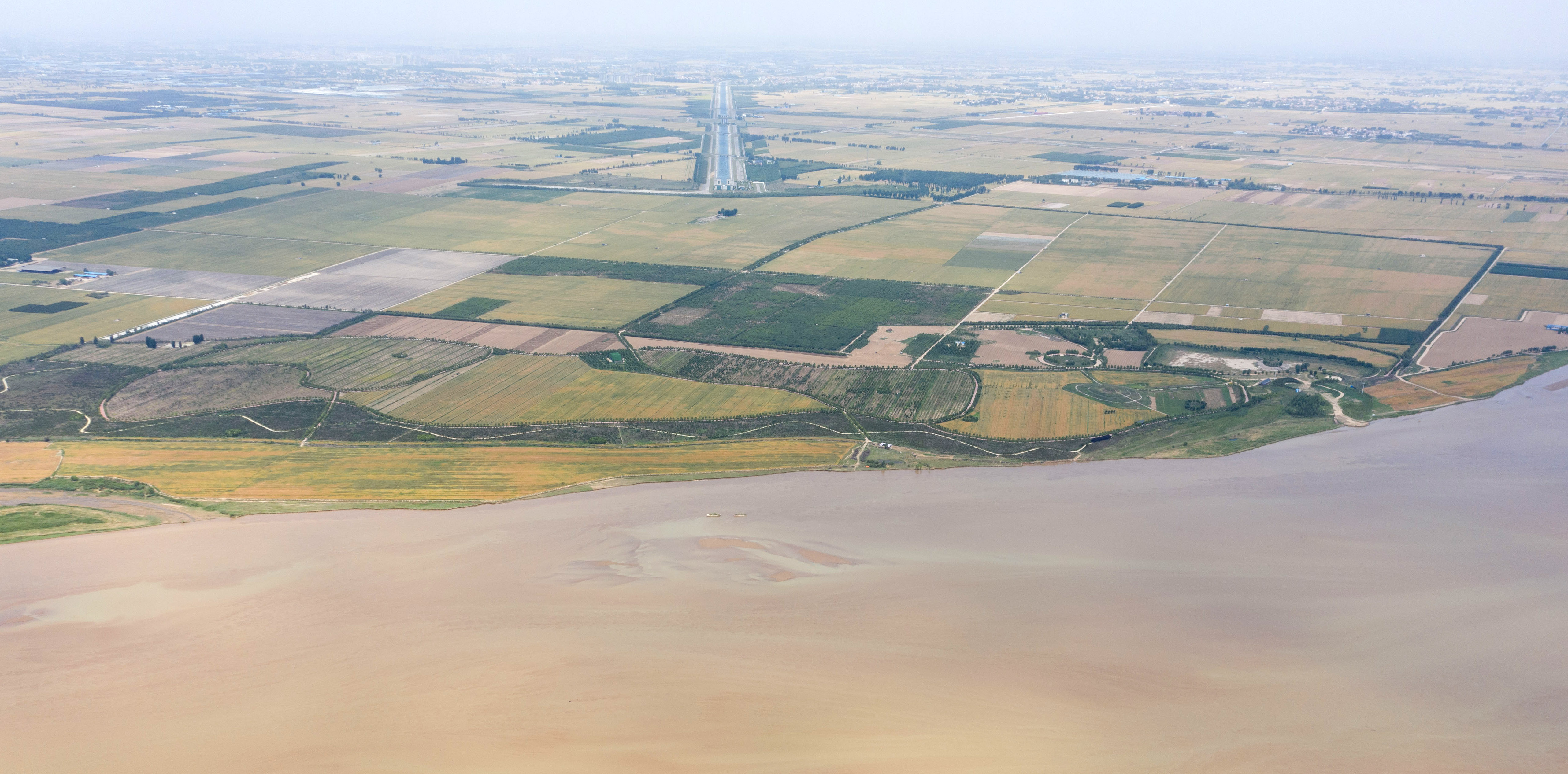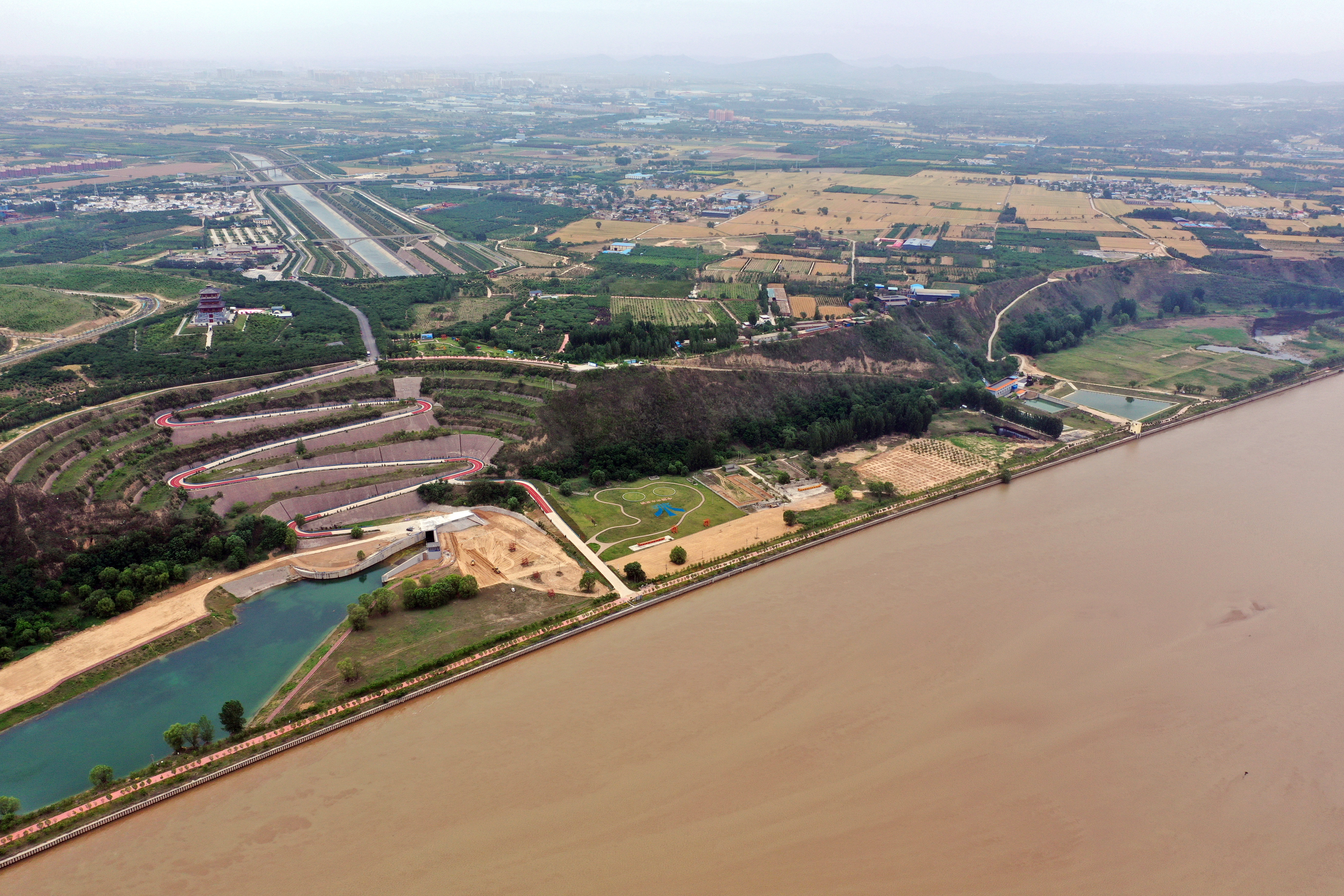 这是5月23日在河南省郑州市拍摄的南水北调穿黄隧洞出口北岸明渠,前景为黄河。(无人机照片)
