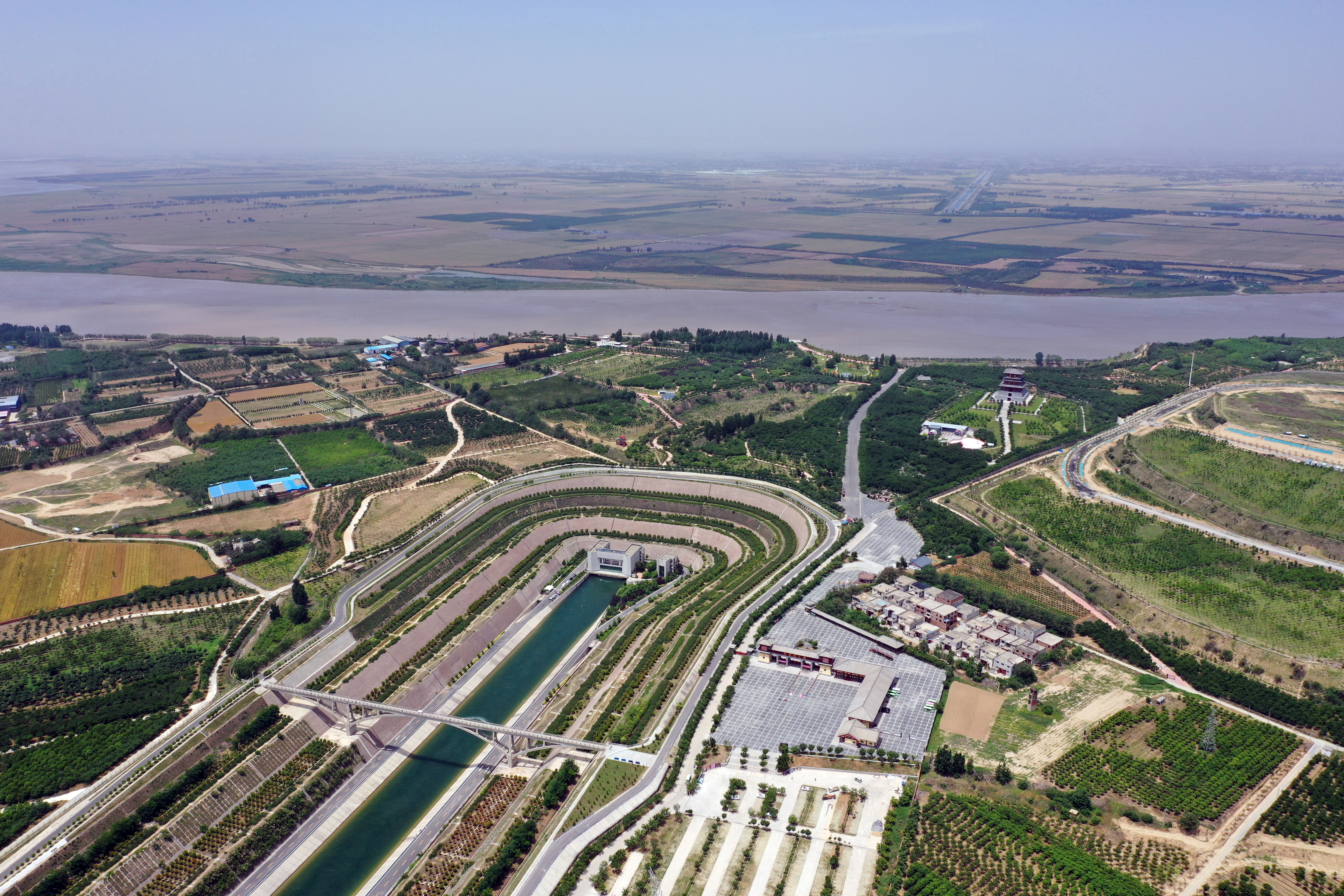 这是5月23日在河南省郑州市拍摄的南水北调中线穿黄隧洞入口南岸明渠,前景为黄河。(无人机照片)