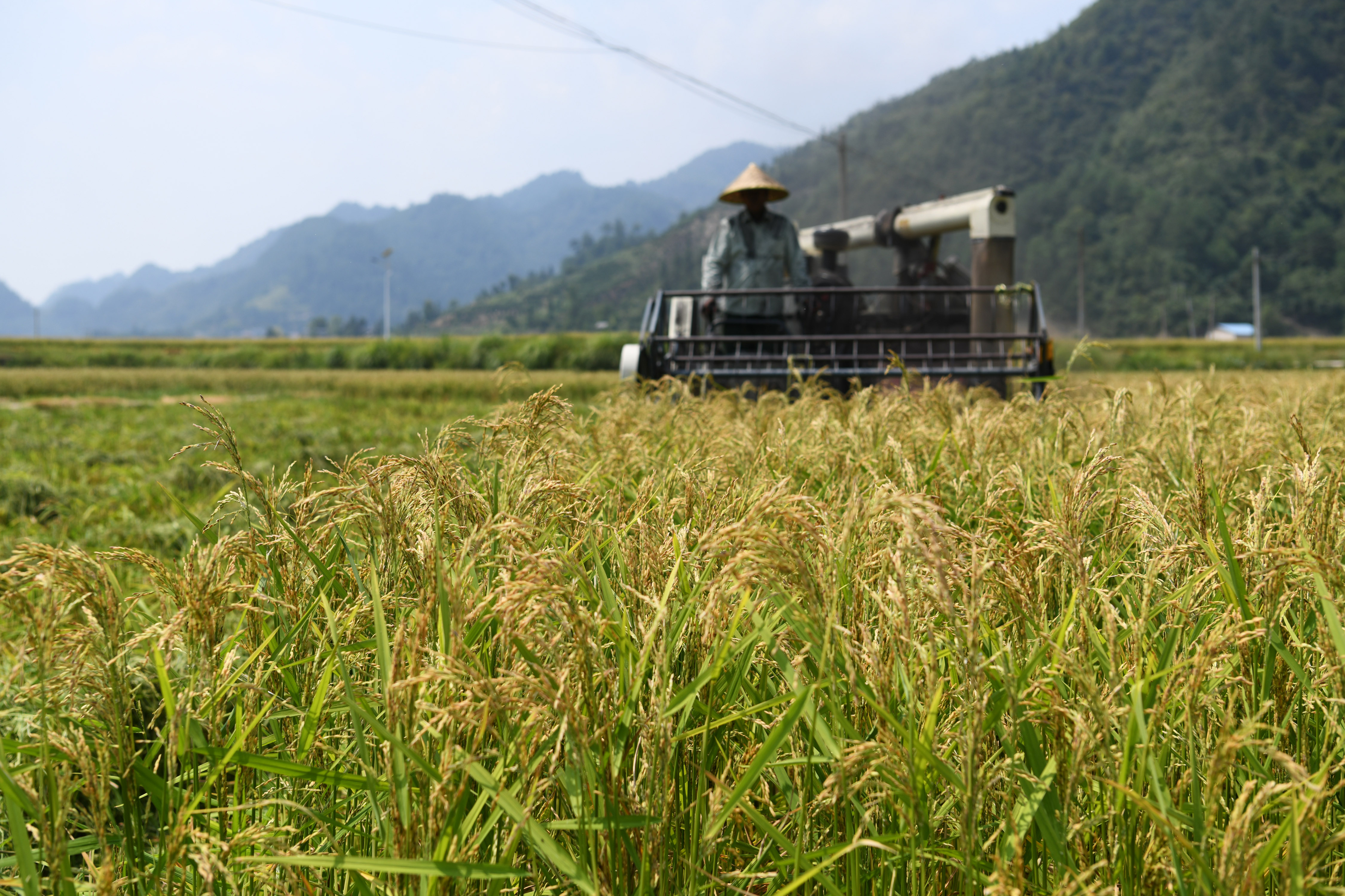 2019年8月20日,种植户在位于贵州省岑巩县注溪镇的国家级杂交水稻制种基地驾驶收割机收获杂交水稻种子。新华社记者杨文斌摄