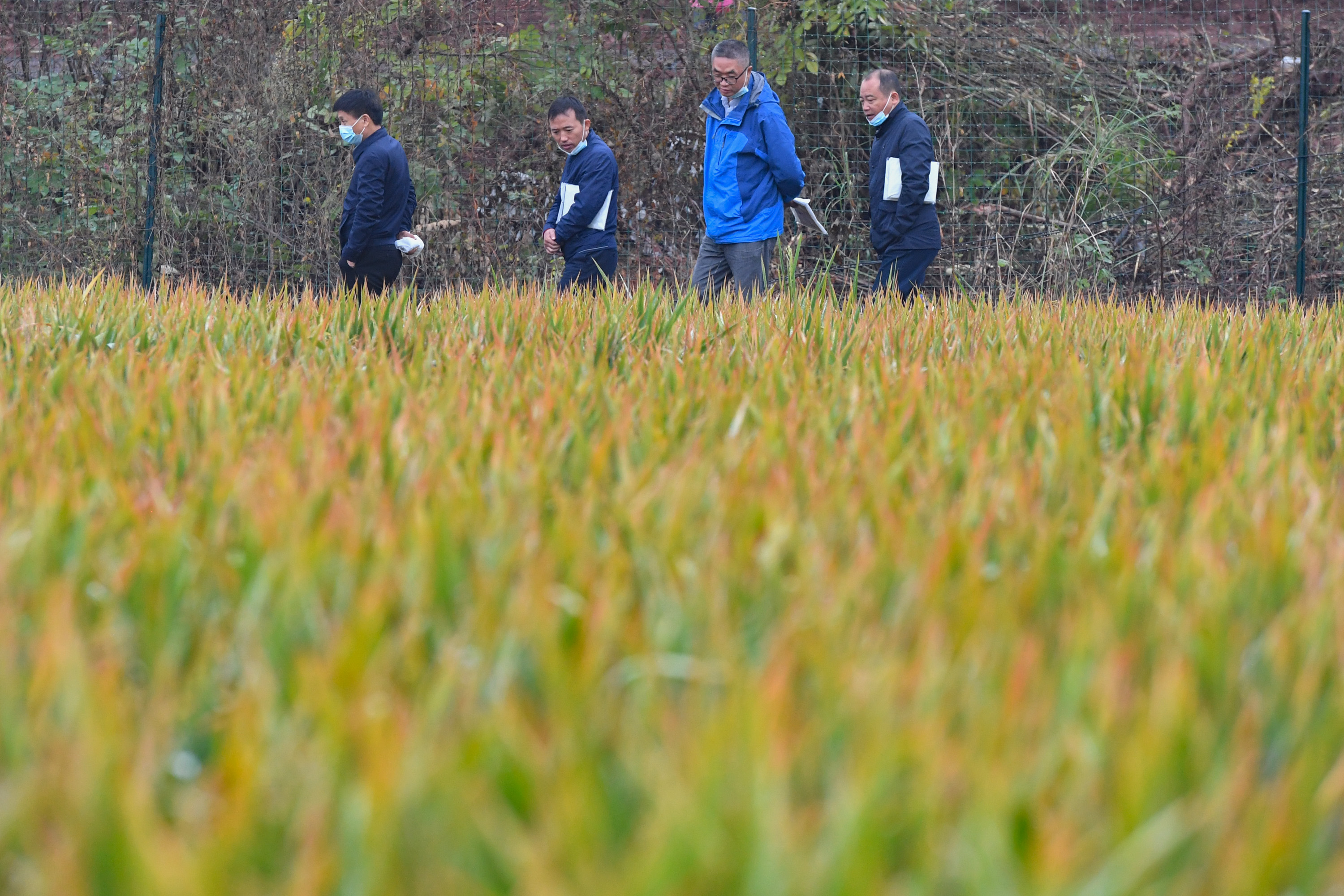 2020年11月2日,在第三代杂交水稻“叁优一号”衡南试验示范基地,专家查看水稻生长情况。 新华社记者 陈泽国 摄